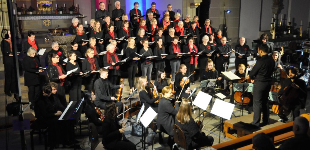 Bereits zu Beginn zauberte der Schein kleiner Lichter, mit denen der festlich gekleidete Chor einzog und sich im Altarraum positionierte, ein besonderes Flair in den Kirchenraum. Hier herrschte Großandrang. Er war bis zum letzten Platz besetzt. Und wer die Auftritte des gemischten Chors in den vergangenen Jahren regelmäßig besucht hatte, der wusste, dass in puncto Strahlkraft, rhythmischer Präzision und Harmonie keine Wünsche offen blieben…